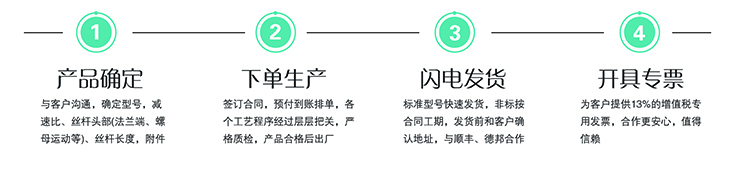 首先要确定产品,与客户沟通,确定型号,减速比、丝杆头部(法兰端、螺母运动等)、丝杆长度,附件;之后是下单生产,签订合同,预付到账排单,各个工艺程序经过层层把关,严格质检,产品合格后出厂;闪电发货,标准型号快速发货,非标按合同工期,发货前和客户确认地址,与顺丰、德邦合作;可开专票,为客户提供13%的增值税,合作更安心,值得信赖。