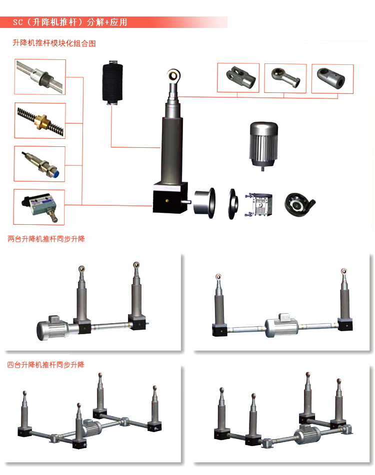 SCb/SCA系列升降机推杆,力姆泰克公司推出全新系列SCB/SCA系列升降机推杆,对于重型载荷的直线运动提供了全新的成熟解决方案,将螺旋升降机推杆/电机/减速电机等附件模块化有机组合一起,实现工业领域的重载提升横移运动,同事高密封的防护等级更适合在恶劣的工作环境中正常工作,是替代液压减少环境污染,节约能源,减少维护成本的高性价比方案。多个升降机推杆同步升降,使用单电机驱动2-18个升降机推杆同步升降,可实现同步,同步精度可至0.1mm,控制简单,可靠性高,我们将提供成套升降系统方案设计,同时提供成套升降系统。